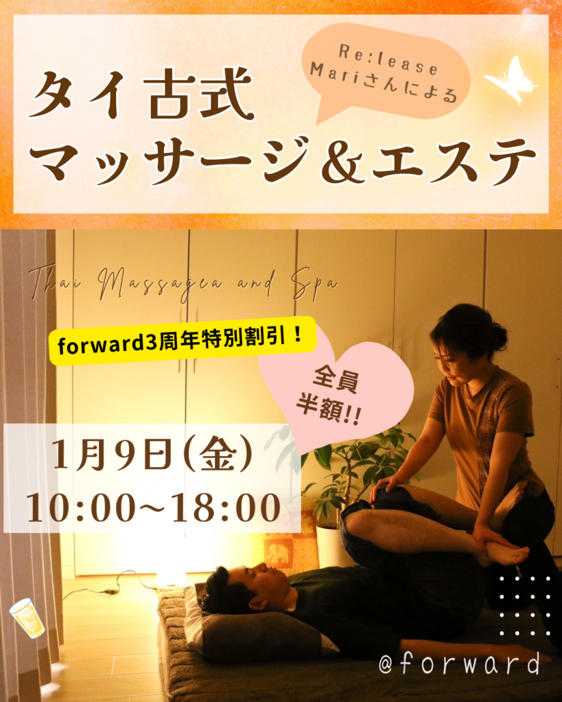 Re:leaseのMariさんによる出張タイ古式マッサージ&エステ💛 新年のスタートに心と身体を整えるのに最適です✨ そして今回は、特別割引🎁!! 2026年1月でforwardが3周年ということもあり、全てのメニューを全員【半額】で施術して... -